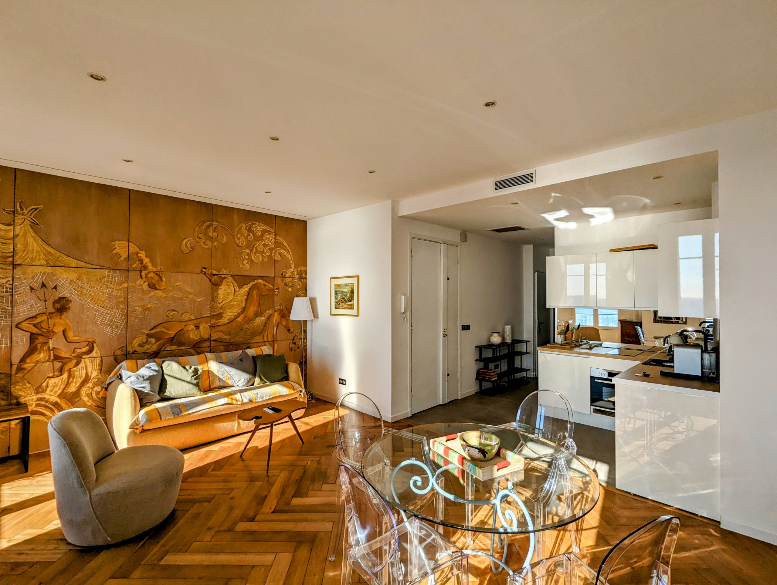 Le Palazzo des Sol est un appartement situé dans un très bel immeuble classé sur la Promenade des Anglais. L'appartement a été entièrement refait à neuf et offre de très belles prestations. Vous trouverez tout d'abord une entrée avec cuisine entièrement équipée, un séjour salle à manger avec une vue magnifique sur la mer, une chambre avec lit extra large, une seconde chambre avec deux lits simples, une salle de douche, un wc séparé. L'appartement est entièrement climatisé et bénéficie d'un calme total. Vous apprécierez prendre votre petit déjeuner sur le balcon qui offre une très belle vue sur la Baie des Anges. Les plages sont en bas de l'immeuble. L'arrêt du tramway est à 100m et le tramway vous déposera en moins de 10 minutes en centre ville ou à l'aéroport. Idéal pour un séjour en location saisonnière sur Nice en famille ou entre amis.